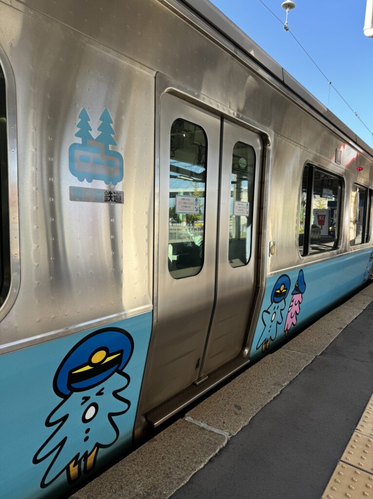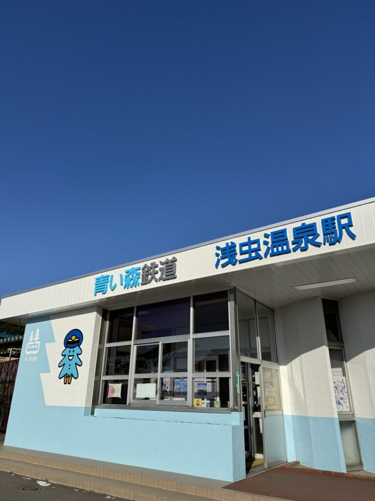 「モーリー」が描かれたキュートな青い森鉄道に乗って浅虫温泉駅へ。