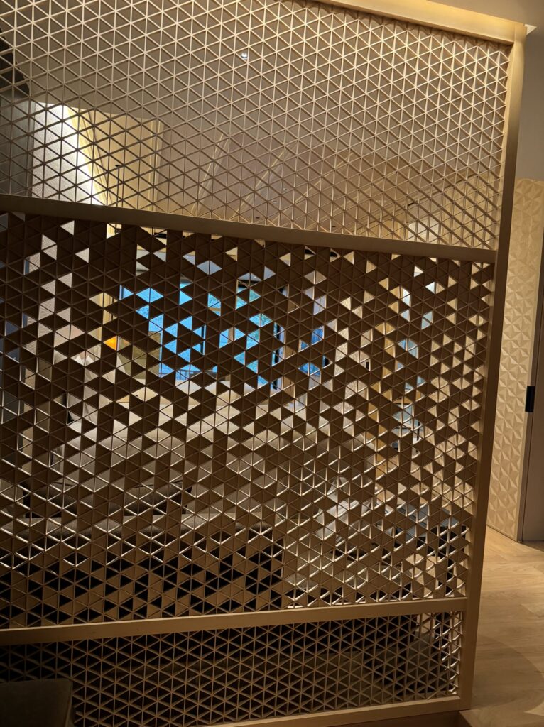 お部屋に案内され入ると、目の前に現れたのは木彫りの衝立。
