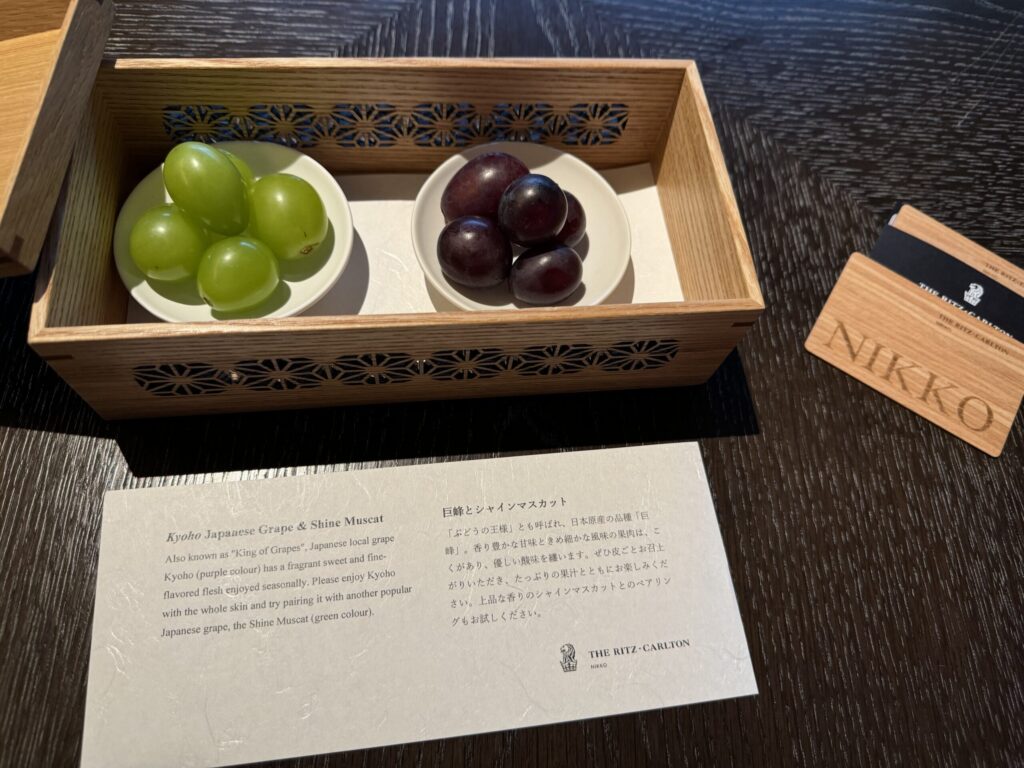 椅子に腰かけて深呼吸して、ウエルカムフルーツの巨峰とシャインマスカットをポン、ポンと口に入れて味わうと、「頑張ってきてよかったなぁ」と、しみじみ。。。