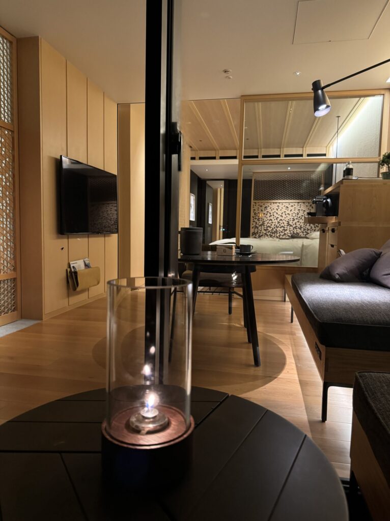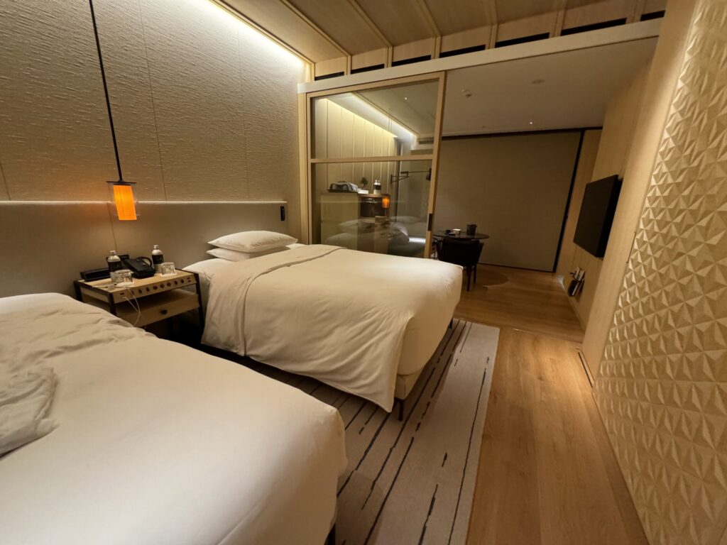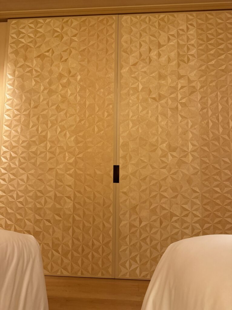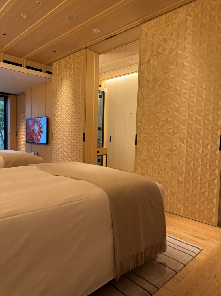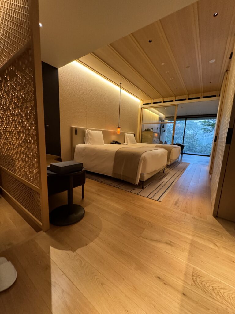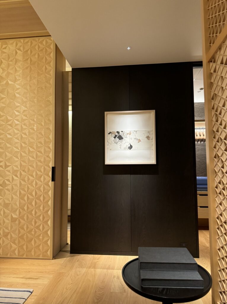 その衝立で玄関とお部屋を区切ってあり、玄関土間(たたき)と室内の床を分けるように少し高い段差があり、まるでどなたかのお家に伺った時の玄関のようで、今までにないホテル体験でした。