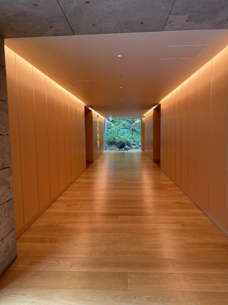 ホテルのエントランスを抜けると、木の香りとやわらかな光。