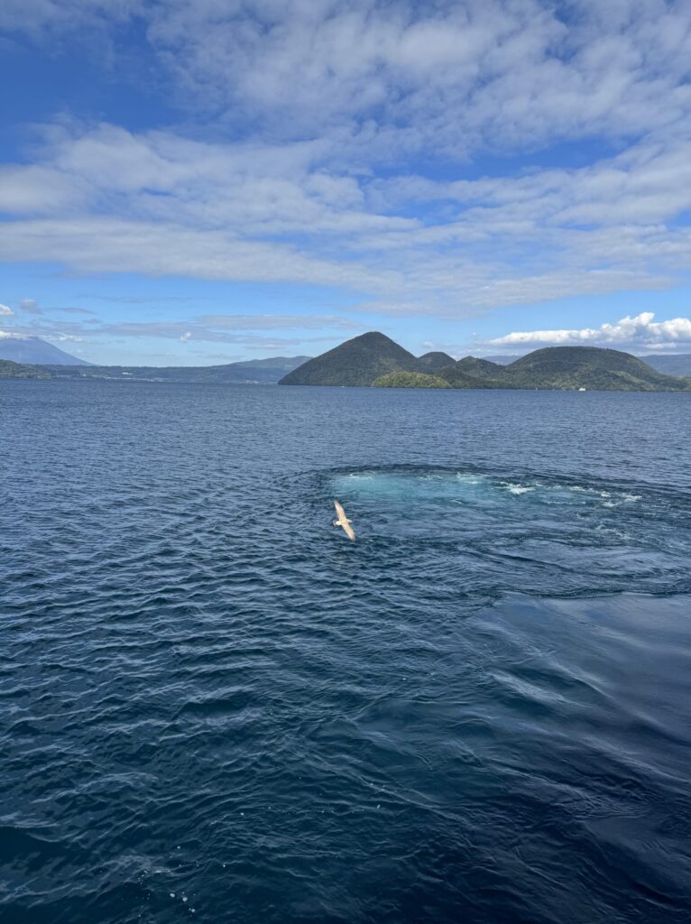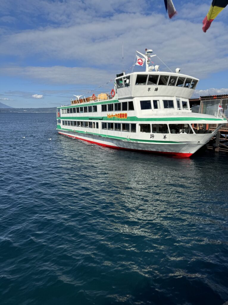 洞爺湖汽船乗り場は、湖底線路のすぐ側にありましたので、出発しそうな遊覧船に速攻で飛び乗っていました。